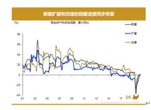 分板块看,疫情后国内投资呈现出如下特征:房地产投资韧性强,基建投资未及预期,制造业投资有望迎来补库阶段。从投资性质看,新建、改建和扩建反弹力度都比较强,没有结构性的分化特征,说明制造业投资回暖具有普遍意义。